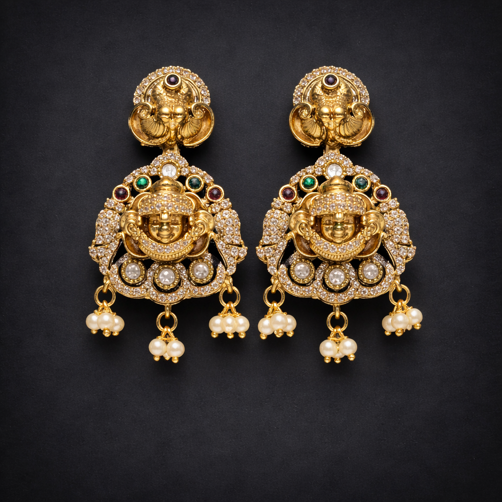 These magnificent temple earrings feature a beautifully sculpted Lord Ganesha motif symbolizing wisdom, prosperity, and protection. Designed with intricate antique gold craftsmanship, sparkling kundan-style stones, and elegant pearl danglers, these earrings offer a divine and luxurious traditional look perfect for special occasions.